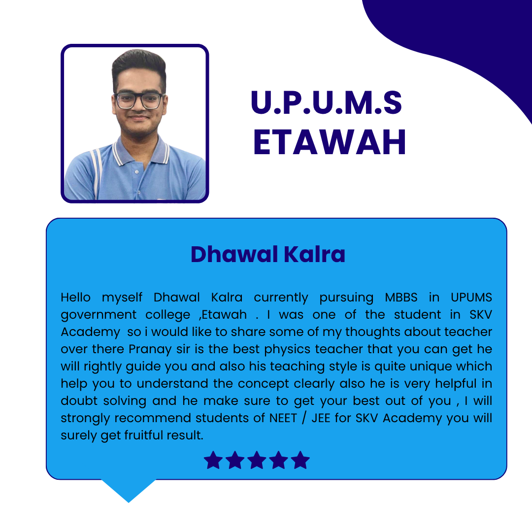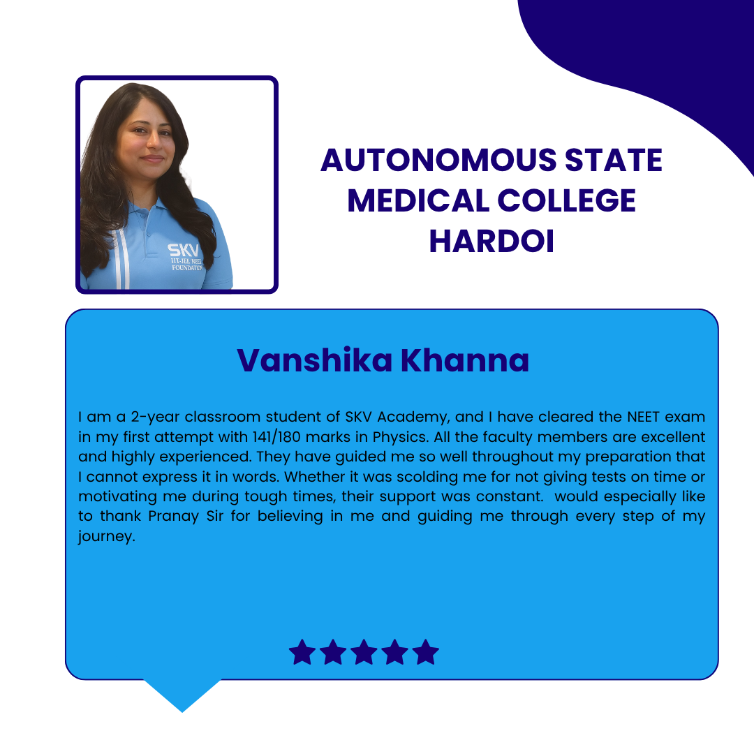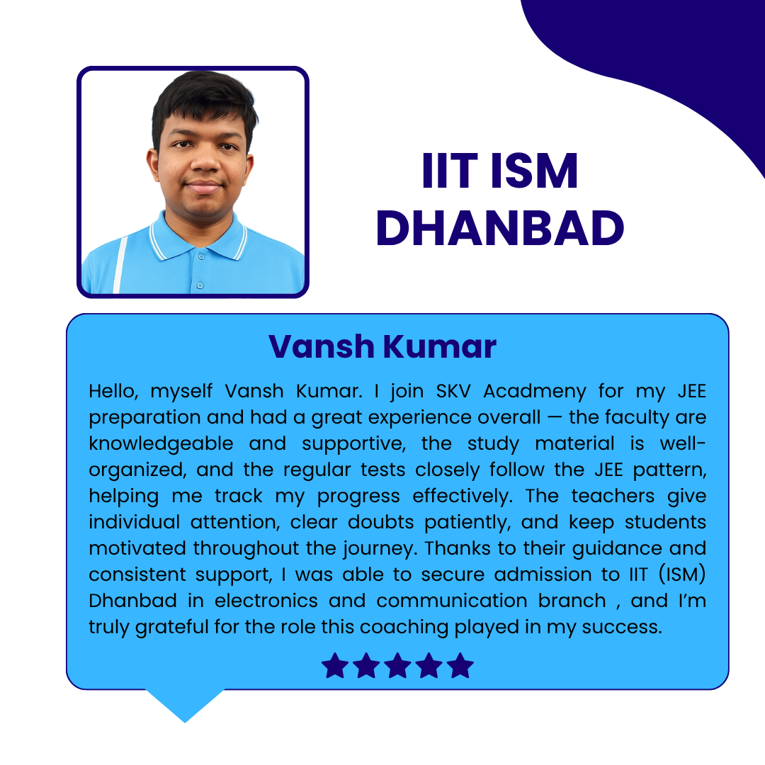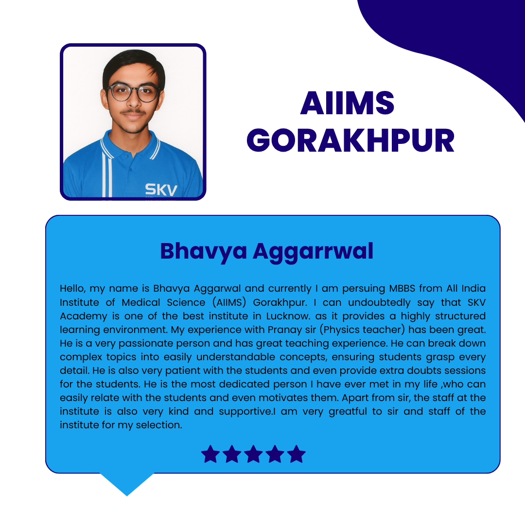 SKV Academy, established in 2023 by Er. Pranay Srivastava, a Mechanical Engineering graduate from IIT ISM Dhanbad, is a premier institute for IIT JEE coaching in Lucknow. With an excellent track record, SKV Academy has produced top ranks, including 1st in UPTU and 1st in CPMT. Many students have achieved their dreams of joining IITs and the best medical colleges in India through the dedicated guidance and expertise offered by SKV Academy.