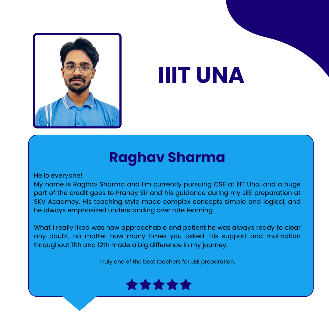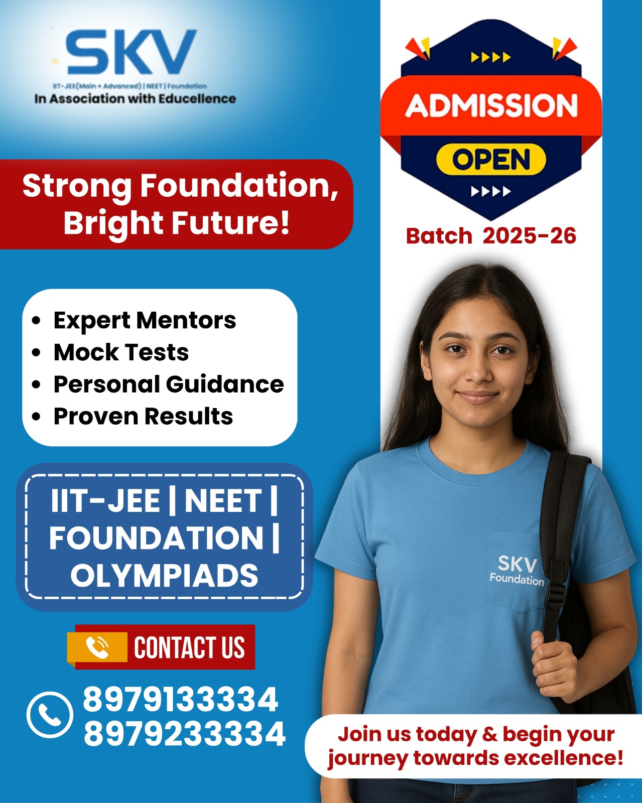 SKV Academy, established in 2023 by Er. Pranay Srivastava, a Mechanical Engineering graduate from IIT ISM Dhanbad, is a premier institute for IIT JEE coaching in Lucknow. With an excellent track record, SKV Academy has produced top ranks, including 1st in UPTU and 1st in CPMT. Many students have achieved their dreams of joining IITs and the best medical colleges in India through the dedicated guidance and expertise offered by SKV Academy.